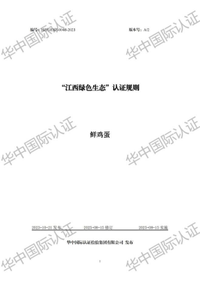 “江西绿色生态-鲜鸡蛋”是一种符合“江西绿色生态”品牌认证的鲜鸡蛋产品,其生产过程严格遵循相关标准,涵盖主体资质、产地环境、种苗要求、健康养殖、产品质量、包装贮运、经营管理及质量追溯等方面。该产品通过严格的认证流程,确保其在生产环境、饲料质量、动物福利、产品质量等方面达到高标准,保障消费者健康与食品安全。“江西绿色生态”——鲜鸡蛋产品认证不仅可以提升产品的市场竞争力,也能够促进江西家禽产业的高质量发展,推动绿色、生态农业的发展,提升产品质量和消费者信任度,同时推动地方农业产业的转型升级和品牌建设。