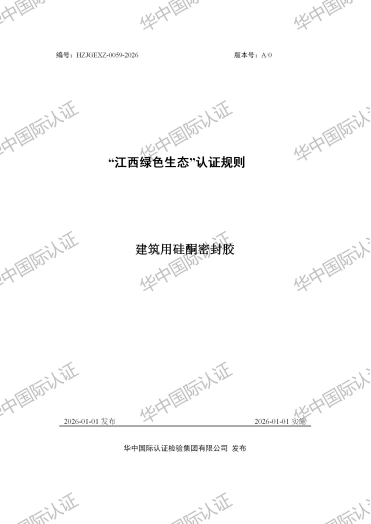 “江西绿色生态”建筑用硅酮密封胶认证,依据DB36/T 1138 《“江西绿色生态”品牌评价通用要求》T/JGE 0110 《江西绿色生态 建筑用硅酮密封胶》进行评定。该认证将安全生产、环保排放、能源消耗以及资源利用率纳入评价范围。企业通过此认证,意味着其产品在环保、节能和质量方面达到了绿色生态标准,不仅能提升品牌公信力,还能在政府采购、绿色建材项目中获得政策支持,树立行业绿色标杆,推动企业向绿色制造转型。